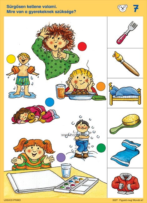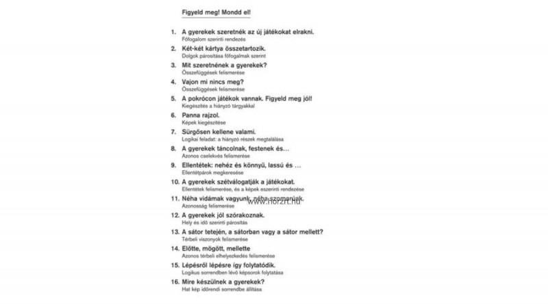 A következő területek fejlesztéséhez kínál játékos gyakorlatokat: érzékelés, koncentráció, mennyiségek és színek ismerete, térbeli tájékozódás, nyelvi kifejezésmód, tárgyi információk, valamint hozzárendelések és analógiaképzés révén logikai összefüggések keresése.