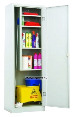 A takarítóeszköztároló szekrény mérete: 60x40x180 cm, 4 db polccal, teherbírás polconként 40 kg, anyaga: acéllemez. Egyedi kialakítás a felmosóvödörnek és az akasztható rudaknak.