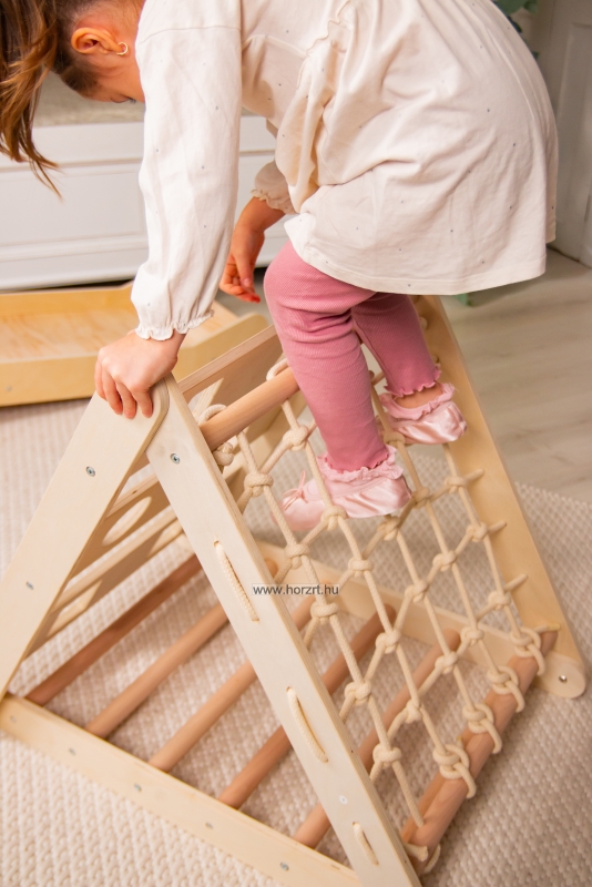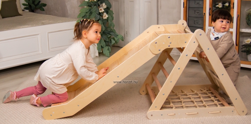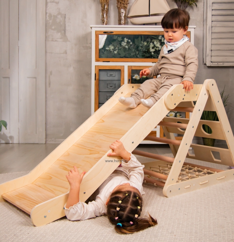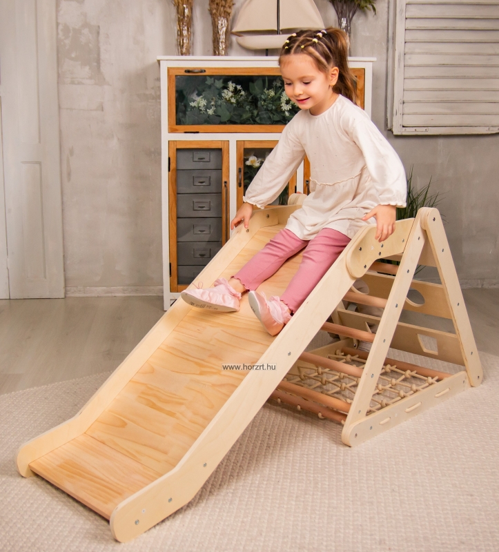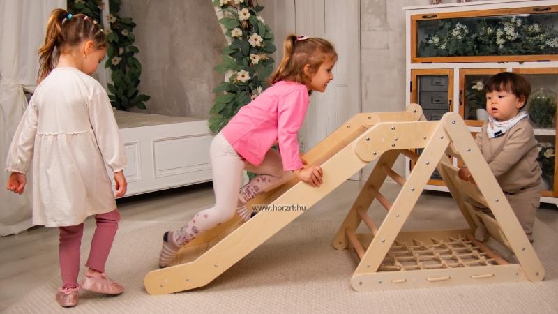 Beltéri mászóka, ami egyesíti a szórakozást és a mozgásfejlődést! Ez a többfunkciós, stabil fa mászórendszer csúszdával és mászóhálóval ösztönzi a kicsiket az aktív játékra és készségeik fejlesztésére.