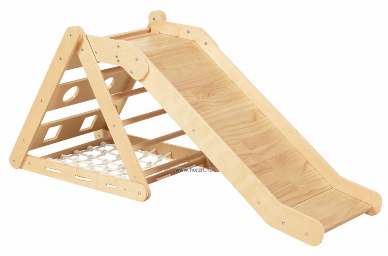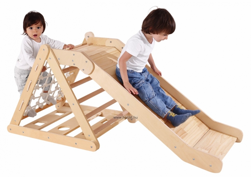 A természetes fa szerkezet stabil és tartós, így hosszú távú használatot biztosít. A beépített csúszda, a különböző formájú mászófelületek és a rugalmas kötélháló izgalmas kihívásokat kínálnak, amelyek hozzájárulnak a motorikus készségek, az egyensúlyérzék és a koordináció fejlesztéséhez. Az eszköz különböző módokon is összeszerelhető, így a gyerekek folyamatosan újabb és újabb kihívásokat élhetnek át.