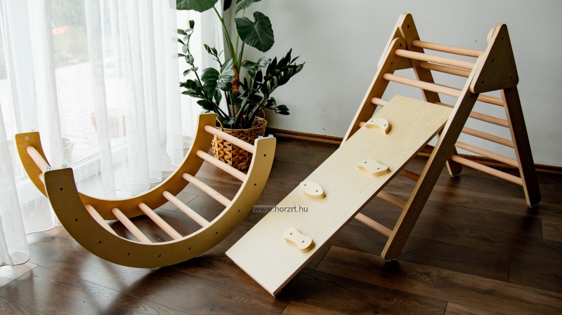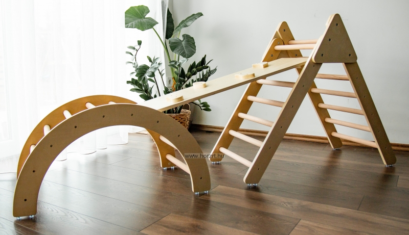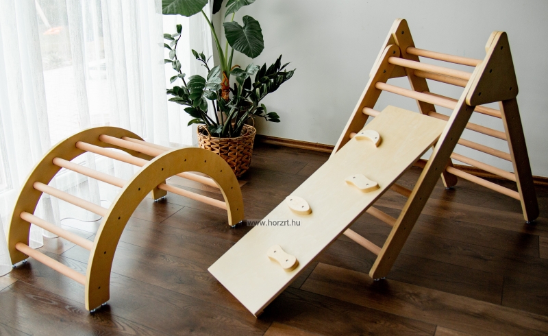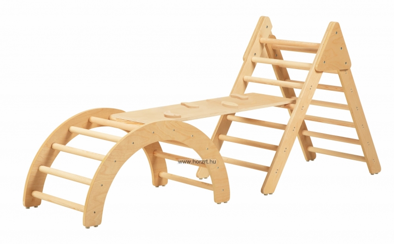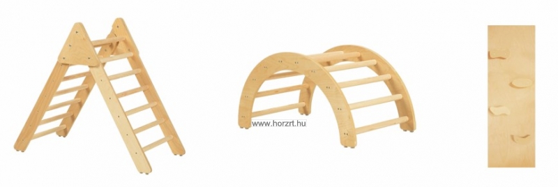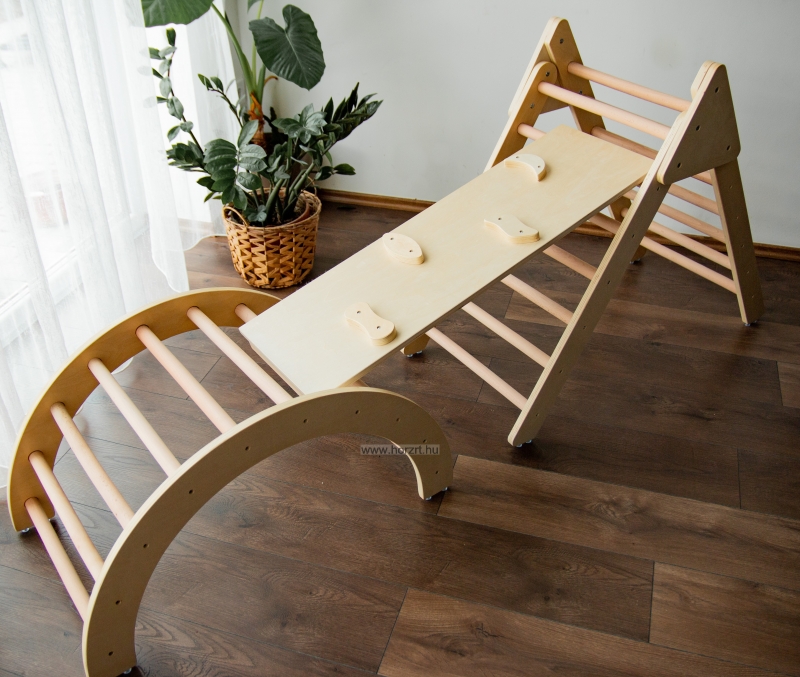 A szett része: Pikler-féle háromszög, íves mászóka, kétoldalú rámpa
