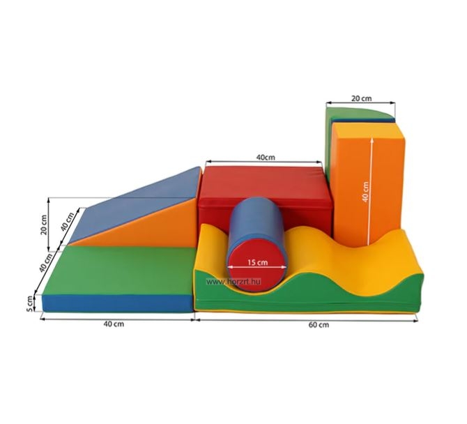 A darabok puha habszivacsból készültek, élénk színű műbőr bevonattal.