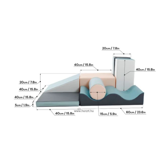 A darabok puha habszivacsból készültek, pasztell színű műbőr bevonattal.