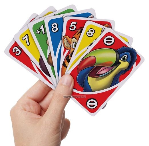 A lapok az UNO ikonikus színes hátterei mellett vadállatok képét is tartalmazzák, ami megkönnyíti a párosítást a 3-4 éves korosztálynak.