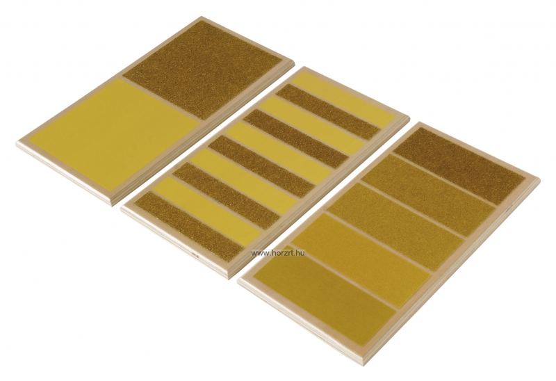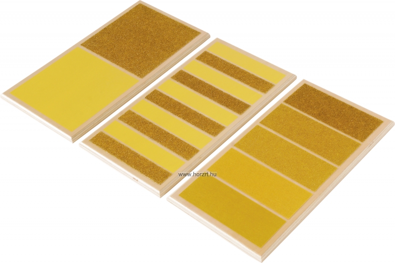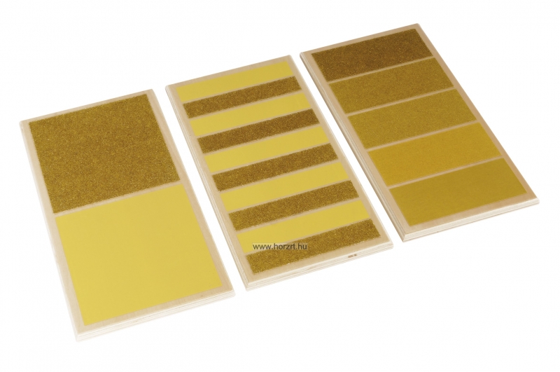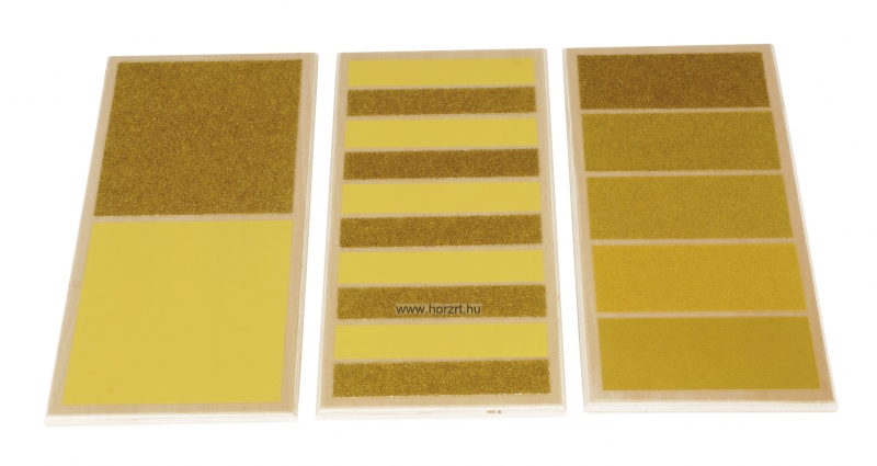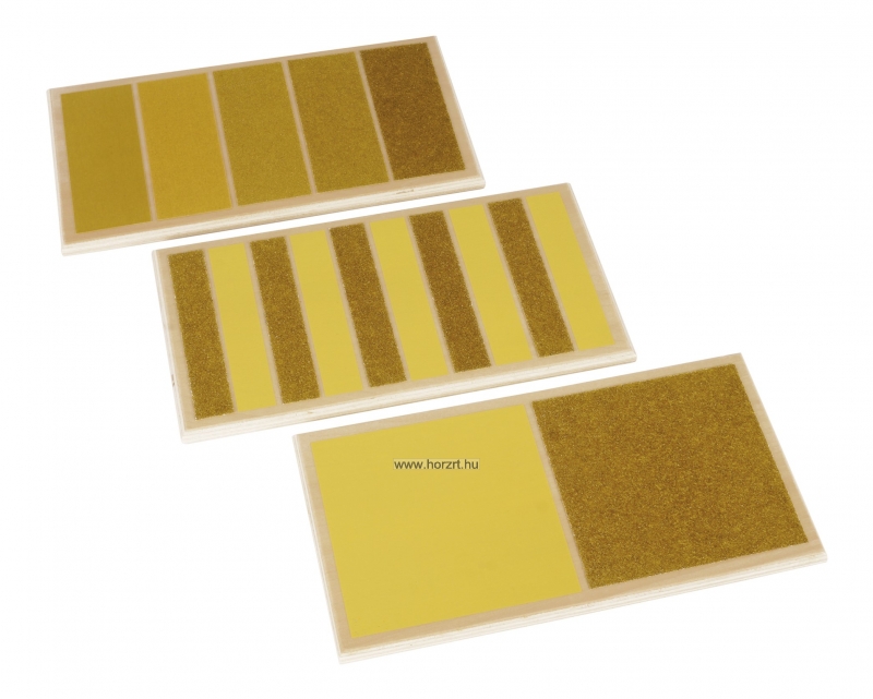 A három darabból álló készlet első táblája két különböző textúraszintet tartalmaz, megmutatva ezzel a durva és sima felületek közötti ellentétet. A második tábla öt sorozatban váltakozó textúrákat tartalmaz, és segít a kézmozgások koordinálásában, miközben az ügyességet is fejleszti. A harmadik tábla öt különböző textúraszintet tartalmaz, a finomtól a durvábbig, ami a tapintásos észlelés finomítására szolgál. A táblák sima fára ragasztott csiszolópapírból készültek.