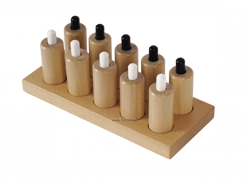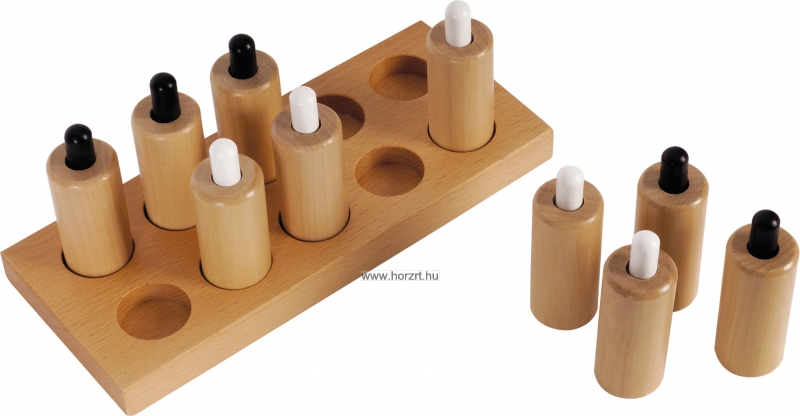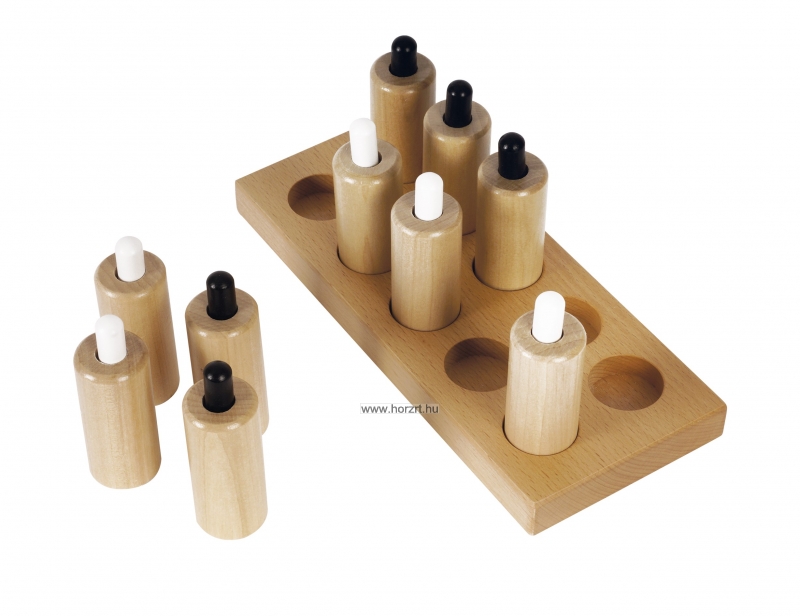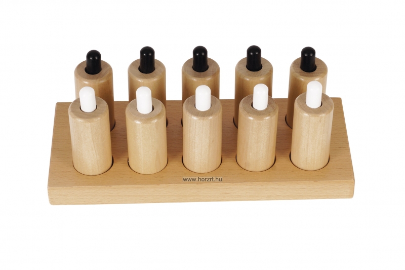 A Nyomás cilinder készlet a gyerekek tapintási érzékelését és finommotorikai készségeit fejlesztik. A készlet 6 pár hengert tartalmaz, amelyek mindegyike különböző ellenállású, amikor a rugós dugattyúkat lenyomják.