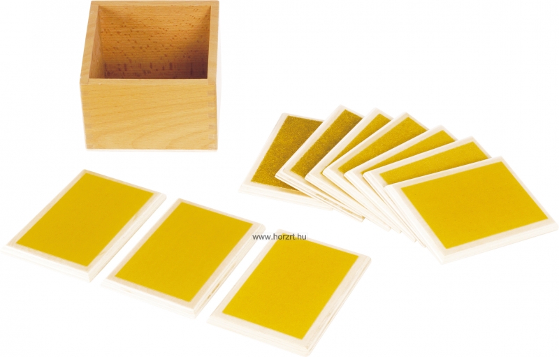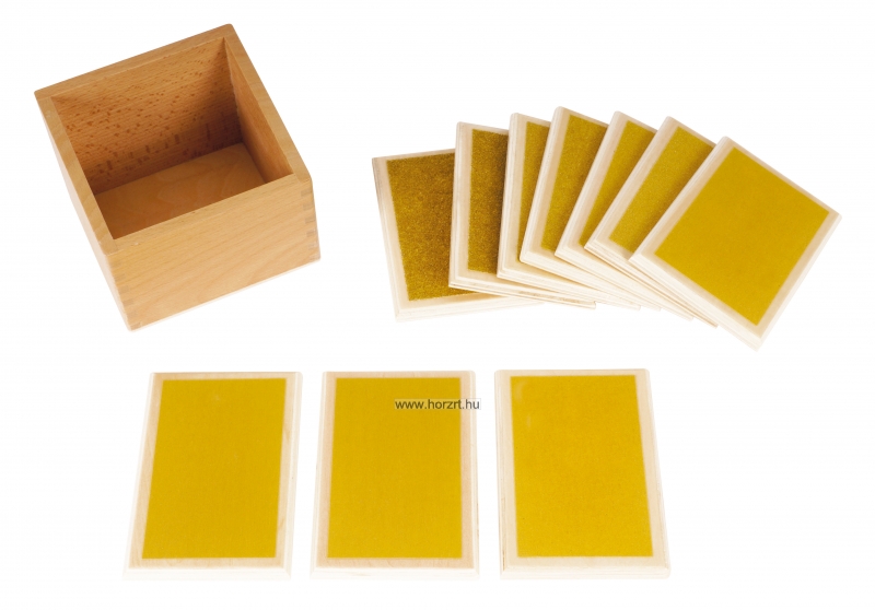 A készlet segít a gyermekeknek fejleszteni tapintási érzékelésüket, miközben felkészíti a kezüket az írásra. Az öt pár táblácska különböző szemcseméretű smirglivel van borítva, így a gyerekek felfedezhetik a durva és finom textúrák közötti különbségeket. A készlet segíti a tapintásos érzékelés, a finommotorikus készségek és a koncentráció fejlődését. A táblácskák egy elegáns, praktikus bükkfából készült tároló dobozban találhatók.