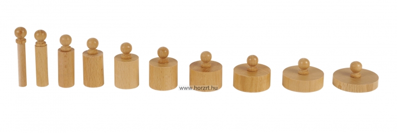 A Montessori Hengersor 3. esetén a hengerek magassága csökken a magastól az alcsonyig, de átmérőjük pedig a vékonytól a vastagig változik.