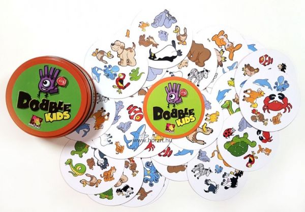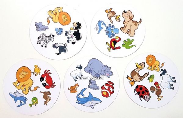 A 30 lapos kártyapakli minden lapján 6 állat látható. A lapokon összesen 30 különböző állatot fedezhetünk fel és bármelyik két lapon pontosan egy állat azonos. Találd meg az azonos állatokat a kártyákon, mielőtt a többiek megelőznének!