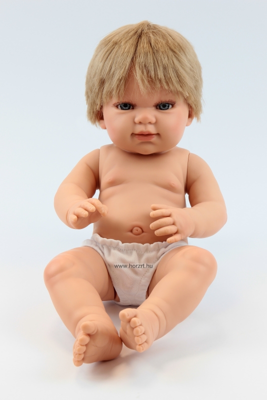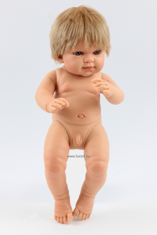 A NINES Európai hajas fiú babája kellemes tapintású műanyag anyagból készült, haja szőke színű, szálas. A test anyagának köszönhetően a baba fürdethető.