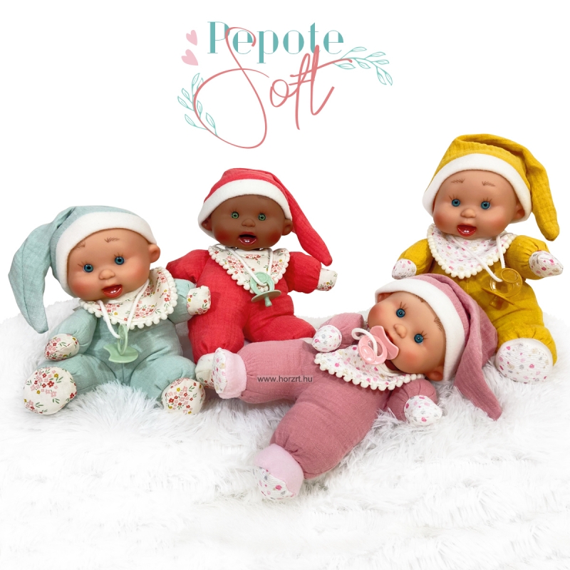 A NINES Gyömi babája, menta színű ruhában puha textil testtel és kellemes tapintású műanyag fejjel lett kialakítva. A baba fején a testtel megegyező színű textil alvósapka található.