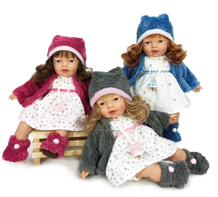 A lány hajasbaba picike fehér ruhácskában érkezik, apró csillagos mintával. A baba szőrös sapkája, kardigánja és cipőcskéje különböző, kék vagy rózsaszín színekben érhetők el.