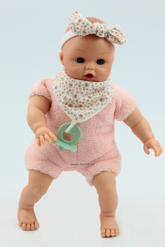 A csecsemő baba picike rózsaszín pizsamában érkezik, apró menta színű cumival a nyakában. A cumi nem illeszkedik a baba szájába!