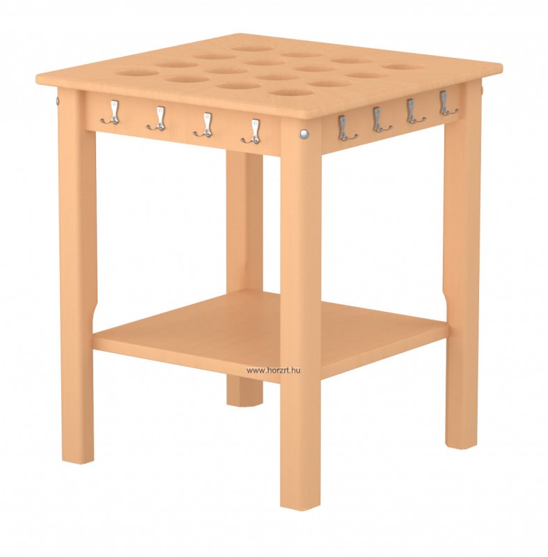 16 pohár számára készült, 16 db kétágú akasztóval ellátott asztal. Lábai fixek. A poharak az előrefúrt lukakba könnyen beilleszthetőek, így mozgatáskor sem kell attól tartanunk hogy a poharak leborulnak. A terméket lapraszerelten szállítjuk.