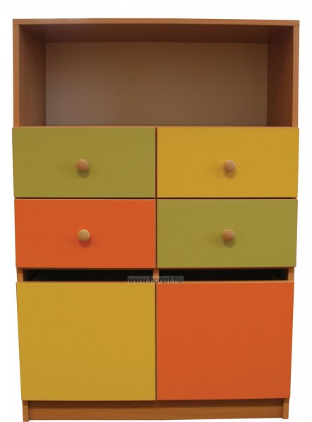 Színes bútoraink laminált bútorlapból készülnek, ABS élzárással. A szekrénysor elemei különböző színekben rendelhetőek, azok tetszőlegesen variálhatóak, így a csoportszoba egyedi igények szerint rendezhető be.