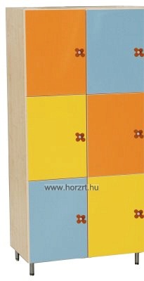 Kedvelt szekrény bölcsődékben, mind a színe, mind a kialakítása miatt. Minden egyes fakk tartalmaz egy polcot és egy kétágú akasztót.