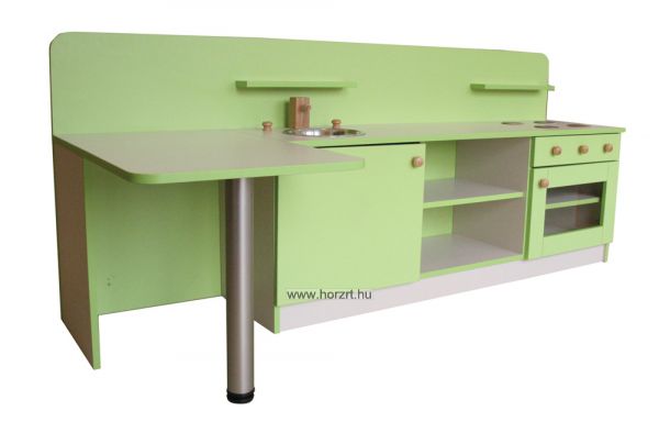 Zöld kis konyha főzőlappal, sütővel, mosogatóval, szekrénnyel és polccal.