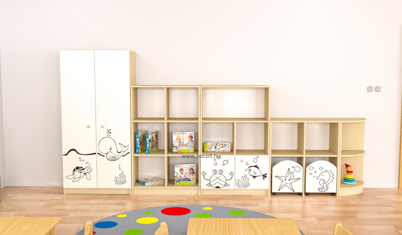 Az anyagában mintázott ajtók, fiókok díszei mind a bútornak, mind a csoportszobának.