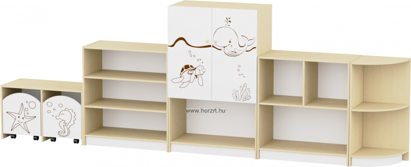 Az anyagában mintázott ajtók, fiókok díszei mind a bútornak, mind a csoportszobának.