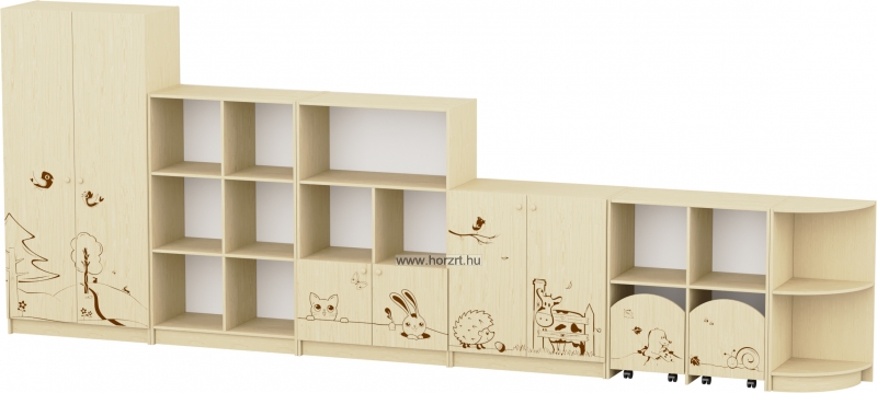Az anyagában mintázott ajtók, fiókok díszei mind a bútornak, mind a csoportszobának.