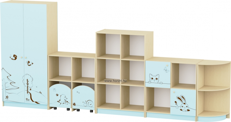 Az anyagában mintázott ajtók, fiókok díszei mind a bútornak, mind a csoportszobának.