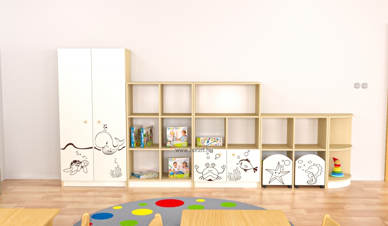 Varázsoljuk egyedivé a csoportszobát a Sziluett Vízivilág és a Sziluett Meserét bútorcsaláddal! A kedves figurák otthonosabb környezetet teremtenek a gyermekeknek. Az anyagában mintázott ajtók, fiókok díszei mind a bútornak, mind a csoportszobának. A bútor alapszíne juhar, a frontok színe választható. Anyaga: laminált bútorlap, lekerekített ABS élzárással.