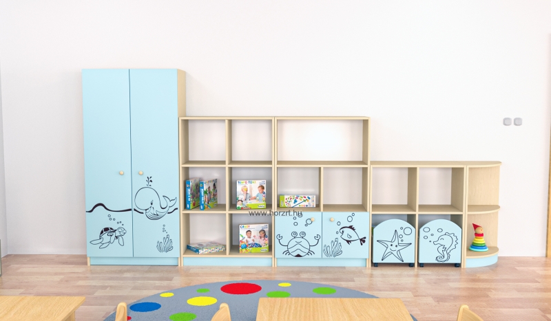 Varázsoljuk egyedivé a csoportszobát a Sziluett Vízivilág és a Sziluett Meserét bútorcsaláddal! A kedves figurák otthonosabb környezetet teremtenek a gyermekeknek. Az anyagában mintázott ajtók, fiókok díszei mind a bútornak, mind a csoportszobának. A bútor alapszíne juhar, a frontok színe választható. Anyaga: laminált bútorlap, lekerekített ABS élzárással.