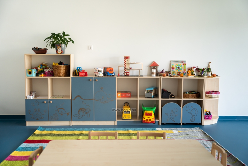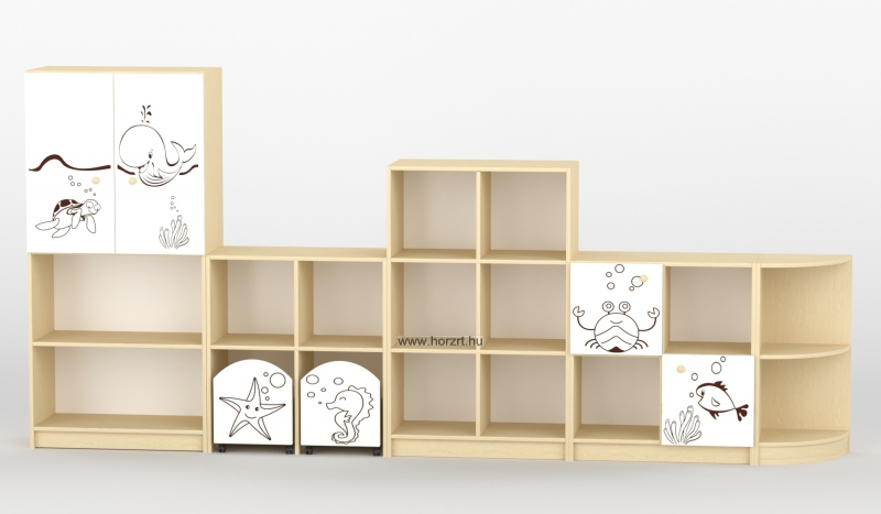 Varázsoljuk egyedivé a csoportszobát a Sziluett Vízivilág és a Sziluett Meserét bútorcsaláddal! A kedves figurák otthonosabb környezetet teremtenek a gyermekeknek. Az anyagában mintázott ajtók, fiókok díszei mind a bútornak, mind a csoportszobának. A bútor alapszíne juhar, a frontok színe választható. Anyaga: laminált bútorlap, lekerekített ABS élzárással.