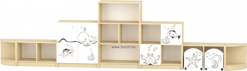 Varázsoljuk egyedivé a csoportszobát a Sziluett Vízivilág és a Sziluett Meserét bútorcsaláddal! A kedves figurák otthonosabb környezetet teremtenek a gyermekeknek. Az anyagában mintázott ajtók, fiókok díszei mind a bútornak, mind a csoportszobának. A bútor alapszíne juhar, a frontok színe választható. Anyaga: laminált bútorlap, lekerekített ABS élzárással.