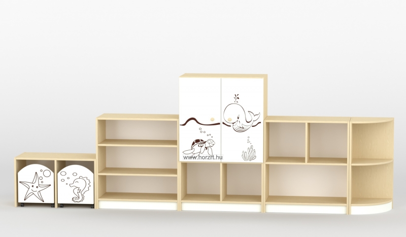 Varázsoljuk egyedivé a csoportszobát a Sziluett Vízivilág és a Sziluett Meserét bútorcsaláddal! A kedves figurák otthonosabb környezetet teremtenek a gyermekeknek. Az anyagában mintázott ajtók, fiókok díszei mind a bútornak, mind a csoportszobának. A bútor alapszíne juhar, a frontok színe választható. Anyaga: laminált bútorlap, lekerekített ABS élzárással.