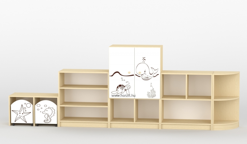 Varázsoljuk egyedivé a csoportszobát a Sziluett Vízivilág és a Sziluett Meserét bútorcsaláddal! A kedves figurák otthonosabb környezetet teremtenek a gyermekeknek. Az anyagában mintázott ajtók, fiókok díszei mind a bútornak, mind a csoportszobának. A bútor alapszíne juhar, a frontok színe választható. Anyaga: laminált bútorlap, lekerekített ABS élzárással.
