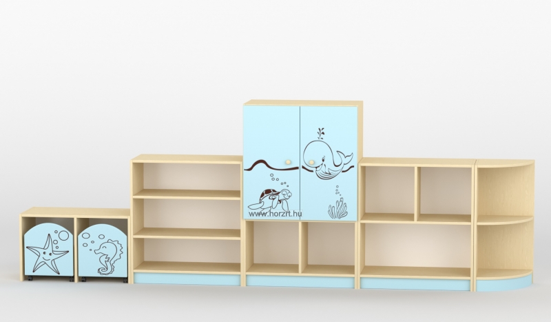 Varázsoljuk egyedivé a csoportszobát a Sziluett Vízivilág és a Sziluett Meserét bútorcsaláddal! A kedves figurák otthonosabb környezetet teremtenek a gyermekeknek. Az anyagában mintázott ajtók, fiókok díszei mind a bútornak, mind a csoportszobának. A bútor alapszíne juhar, a frontok színe választható. Anyaga: laminált bútorlap, lekerekített ABS élzárással.