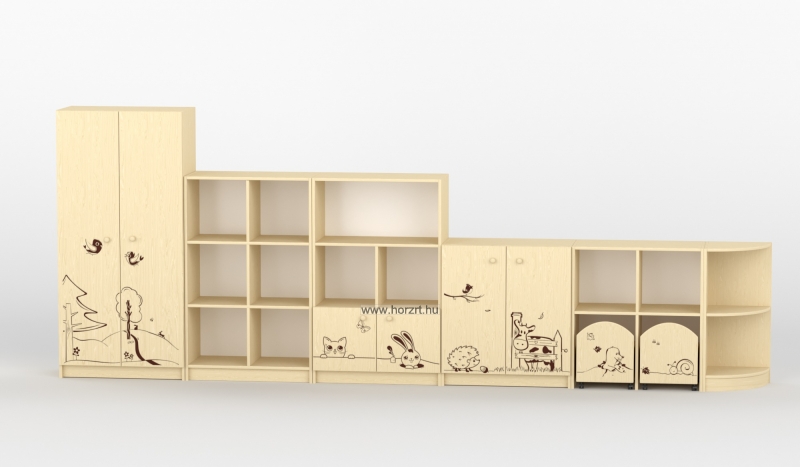 Varázsoljuk egyedivé a csoportszobát a Sziluett Vízivilág és a Sziluett Meserét bútorcsaláddal! A kedves figurák otthonosabb környezetet teremtenek a gyermekeknek. Az anyagában mintázott ajtók, fiókok díszei mind a bútornak, mind a csoportszobának. A bútor alapszíne juhar, a frontok színe választható. Anyaga: laminált bútorlap, lekerekített ABS élzárással.