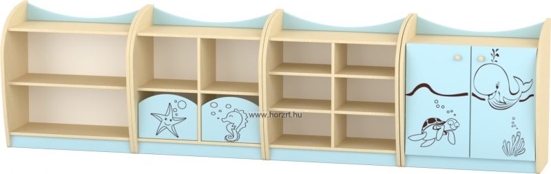Varázsoljuk egyedivé a csoportszobát a Sziluett Vízivilág és a Sziluett Meserét bútorcsaláddal! A kedves figurák otthonosabb környezetet teremtenek a gyermekeknek. Az anyagában mintázott ajtók, fiókok díszei mind a bútornak, mind a csoportszobának. A bútor alapszíne juhar, a frontok színe választható. Anyaga: laminált bútorlap, lekerekített ABS élzárással.