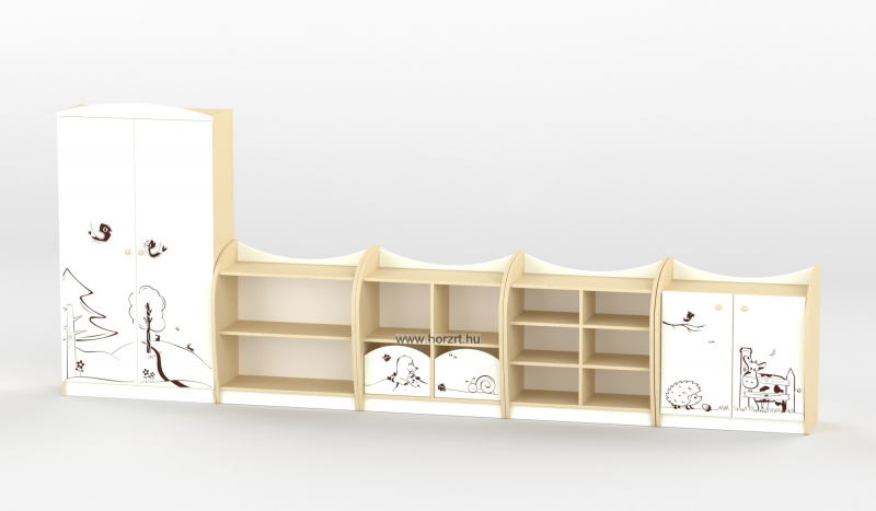 Varázsoljuk egyedivé a csoportszobát a Sziluett Vízivilág és a Sziluett Meserét bútorcsaláddal! A kedves figurák otthonosabb környezetet teremtenek a gyermekeknek. Az anyagában mintázott ajtók, fiókok díszei mind a bútornak, mind a csoportszobának. A bútor alapszíne juhar, a frontok színe választható. Anyaga: laminált bútorlap, lekerekített ABS élzárással.