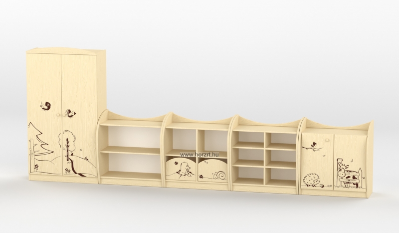Varázsoljuk egyedivé a csoportszobát a Sziluett Vízivilág és a Sziluett Meserét bútorcsaláddal! A kedves figurák otthonosabb környezetet teremtenek a gyermekeknek. Az anyagában mintázott ajtók, fiókok díszei mind a bútornak, mind a csoportszobának. A bútor alapszíne juhar, a frontok színe választható. Anyaga: laminált bútorlap, lekerekített ABS élzárással.