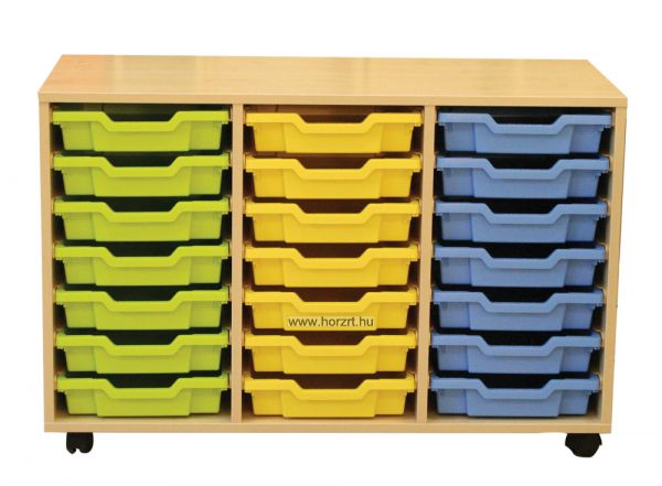 A jó minőségű, laminált bútorlapból készült tárolószekrények műanyag tálcájának segítségével, könnyen rendet tehetnek a gyerekek a csoportszobában. A sok tálca lehetőséget ad a gyerekeknek és a pedagógusoknak az átláthatóságra. A tárolószekrények görgőik segítségével könnyedén mozgathatóak. A szekrényben lévő tálcák masszív, tartós műanyagból készültek, könnyen tisztán tarthatóak.