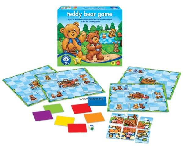 24 db Teddy maci kártya, 6 db piknik kosár kártya, 4 db piknik takaró tábla, 1 db dobókocka