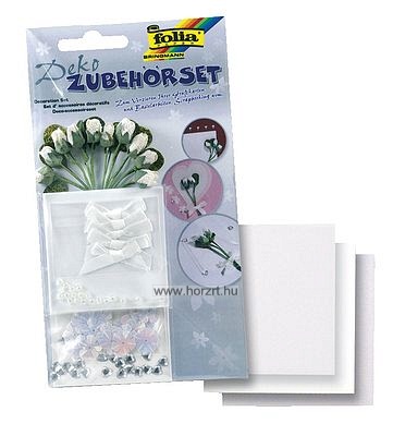 10 darab fehér rózsa, 5 darab fehér masni, fehér gyöngyök, szívecskék, fehér flitter virágok, dekorlapok vannak a készletben.