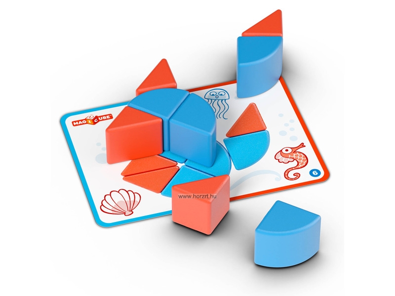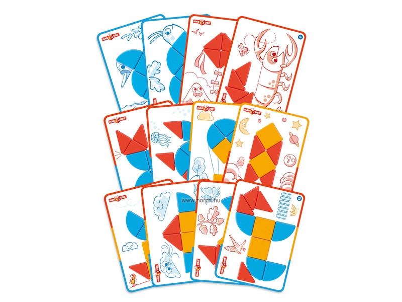 A 6 db kétoldalas kártya összesen 12 különböző utasítást tartalmaz, amelyek lépésről lépésre segítik az alkotási folyamatot. A kártyák és mágneses elemek kombinációja fejleszti a gyerekek képzeletét és kreatív gondolkodását.