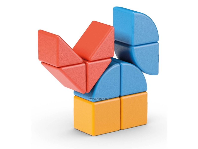 A színes (kék, sárga, piros) mágneses építőelemek egyszerűen összeilleszthetők és újrahasznosított anyagok felhasználásával készült, így a játék környezetbarát megoldást kínál.