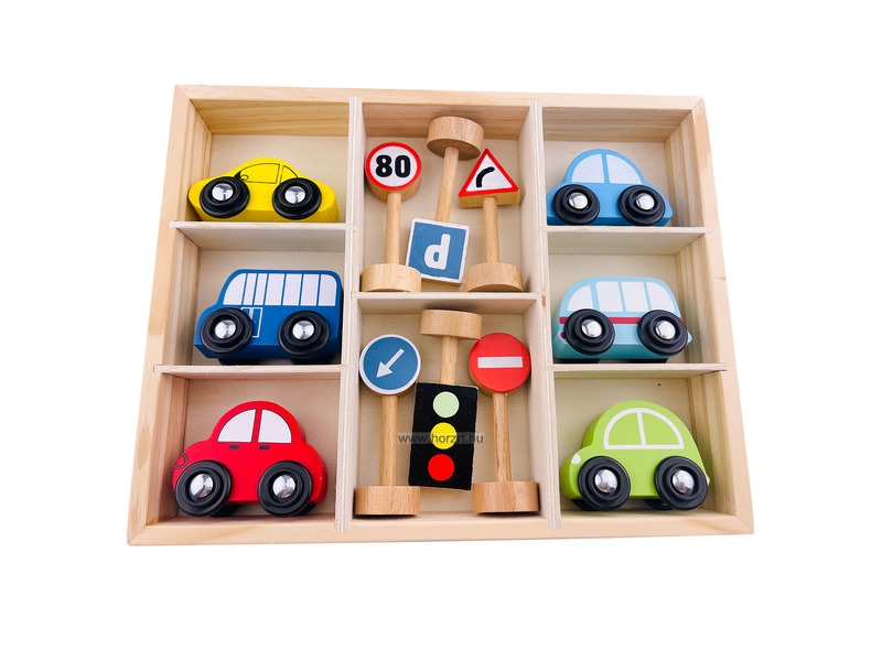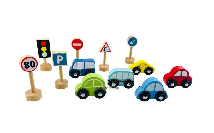 Tanulás és játék! A fa kisautók és táblák egy stapabíró, fa játék készlet, amely szórakoztató módon segít a gyerekeknek megismerkedni a közlekedési szabályokkal, a közlekedés világával.