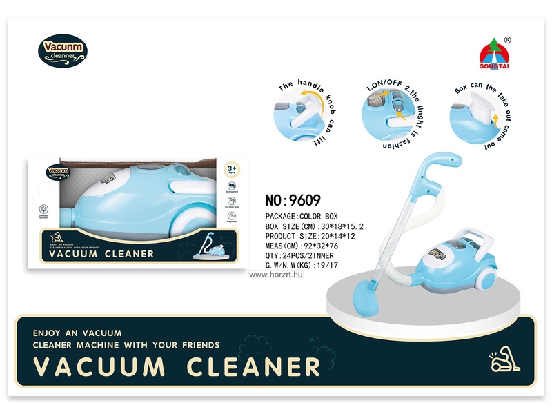Az elemes játék porszívó egy igazán élvezetes és tanulást ösztönző játék. A porszívó bekapcsoláskor hangokat ad ki, és a tartályában lévő fehér törmelék mozgása valósághű élményt nyújt. A fogantyúja megkönnyíti a hordozást és a használatot. A játék 4 db AA ceruzaelemmel működik, melyeket a csomagolás nem tartalmaz.
