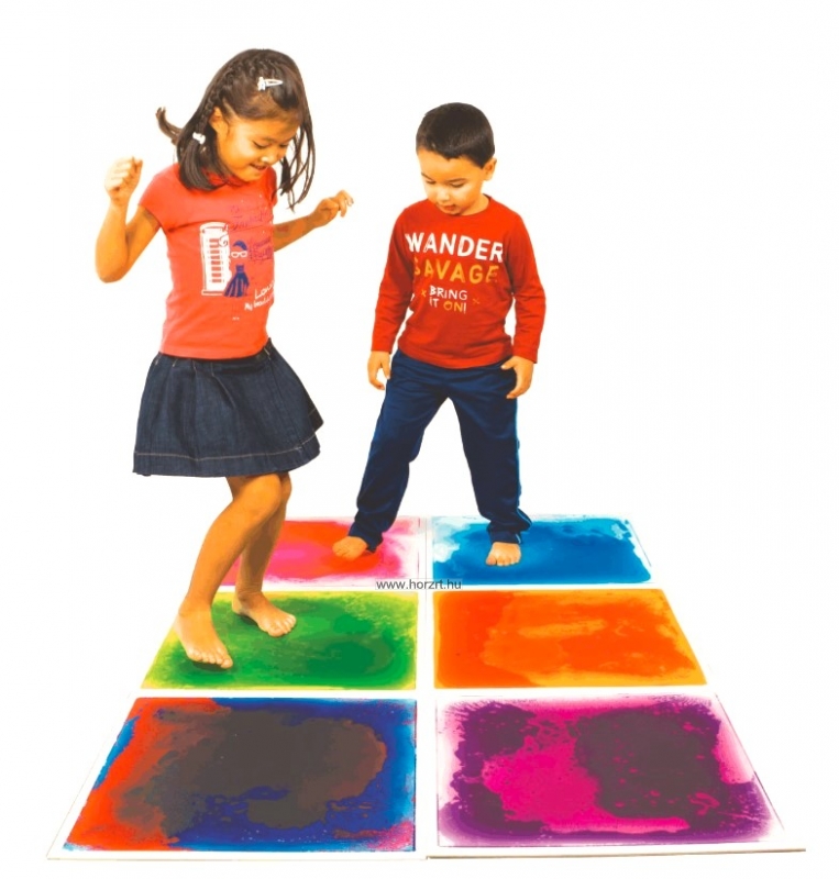 A folyadékkal töltött padlólapokból álló szett 6 különböző színű elemet tartalmaz, melyeken a gyerekek játékos formában fejleszthetik mozgáskoordinációjukat és erősíthetik a nagyobb izomcsoportokat. Emellett kiválóan támogatja a testi és lelki egyensúly megőrzését, valamint ezek folyamatos fejlesztését is. Folyadékkal töltött szenzoros padlólapok, amelyekben a színek mozgásba lendülnek és kavargó mintázatokat alkotnak, amikor rálépünk. Használatuk kellemes tapintási élményt nyújt, miközben ösztönzi a gyermek érzékelését és észlelési folyamatait. A csúszásmentes kialakítás biztonságos használatot tesz lehetővé, segít megelőzni a baleseteket. Könnyen tisztítható és praktikusan tárolható.