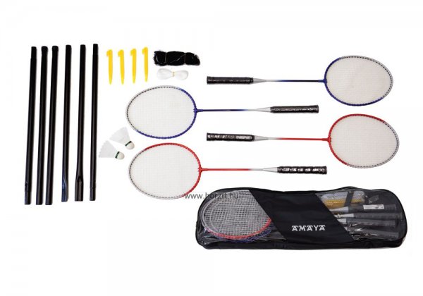 A készlet tartalma: 4 db fém tollasütő, összerakható fémvázas tollasállvány, tollasháló + tollaslabdák.