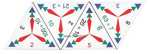 A háromszögletű kártyákon szereplő műveleteket elvégezve és az eredménnyel összepárosítva olyan ábrát kapunk, amellyel ellenőrizhetjük a megoldás helyességét.