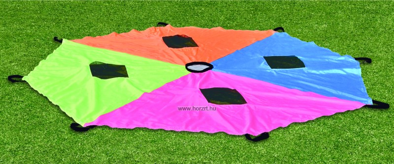 Több helyen megerősített kivitel. Nagyszerű, szórakoztató eszköz a csapatkoordinációs tevékenységekhez és játékokhoz, hiszen több résztvevő mozgását kell összehangolni, mert csak ezáltal emelkedik fel a magasba az ejtőernyő.