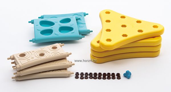 Számos variációban összeállítható mozgásfejlesztő készlet kicsiknek. Tartalma: 4 db háromszög elem, 3 db keskeny elem, 2 db széles elem, 20 db anyacsavar, 1 db műanyag csavarkulcs. Az elemek bemélyedései a gyerekek kezére és lábára illeszkednek. Ezek a bemélyedések segítenek a gyerekeknek, hogy könnyebben és biztonságosabban tudjanak mászni. Az elemek dőlésszöge is változtatható.