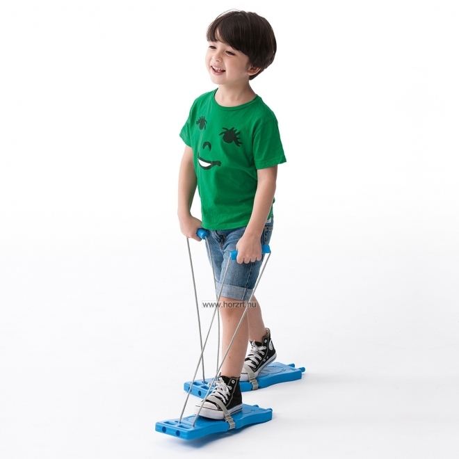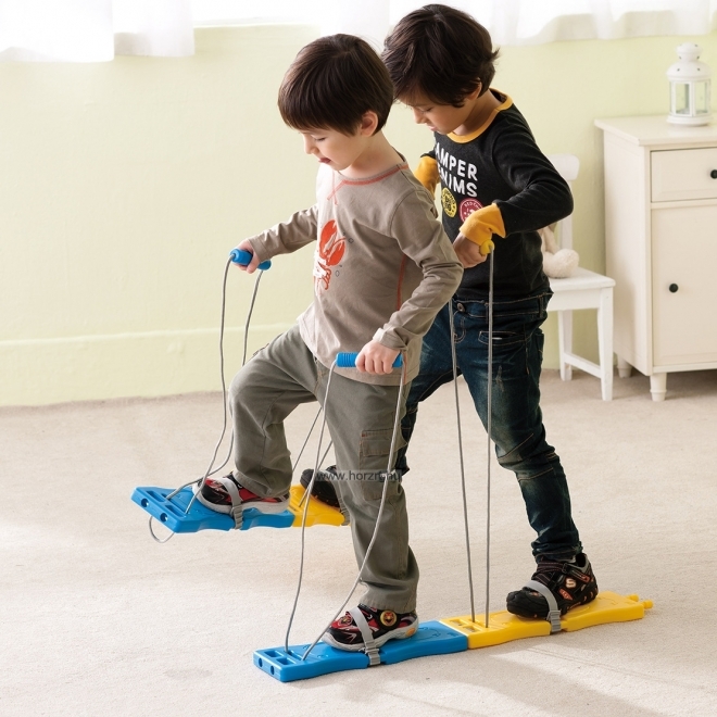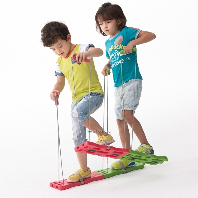 Tartalma: 4 pár lépegető. A lépegető talpakat egymáshoz biztonságosan lehet rögzíteni. Nagy kihívás a gyermekeknek, mivel koordinálni kell saját mozgásukat és alkalmazkodniuk kell a többiek tempójához. Kiváló nagymozgásos és kooperációs készségeket fejlesztő eszköz. Szétszedve használható egyénileg is.