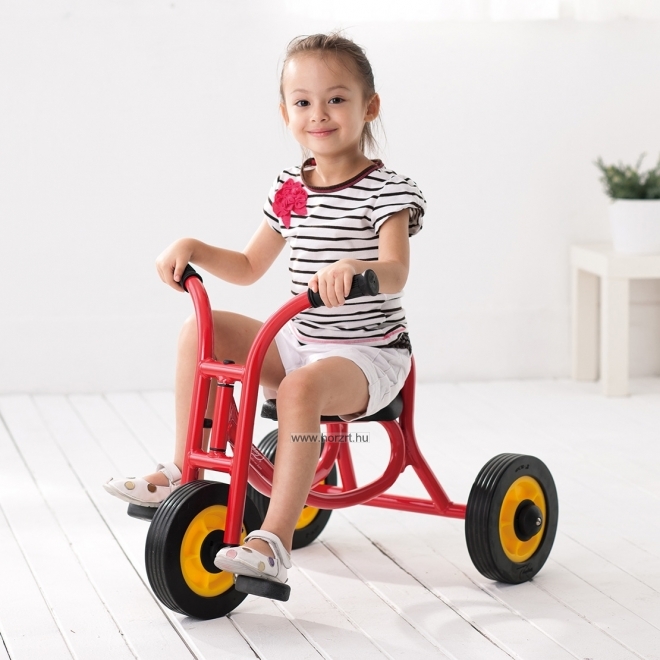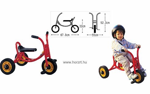 Masszív kivitelű, ugyanakkor kifejezetten óvodai felhasználásra tervezett tricikli. Rendkívül erős, strapabíró váz. Csendesen gördülő kerekek. (A keréktárcsákon nincs lyuk, a balestek elkerülése érdekében.) Masszív pedálok. (A pedálokon nincs lyuk, a lábujjak beszorulásának elkerülése érdekében.) Szétszerelt állapotban szállítjuk. Összeszerelése nem igényel szakértelmet, könnyen, gyorsan megoldható. S-es méret.